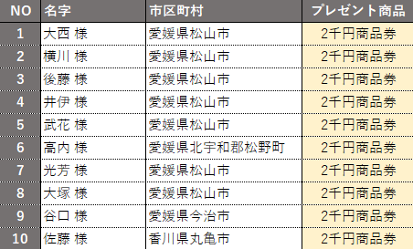 商品券2千円プレゼントですが、上記10名の方が当選されましたので、