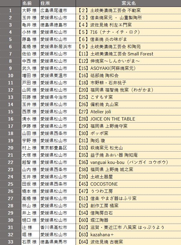 ご応募頂きました「器コンテスト投票&アンケート」の”抽選であなたが選んだ器をプレゼント”に上記33名の方が当選されましたので、お知らせいたします。